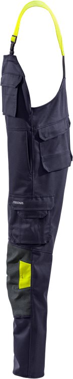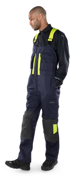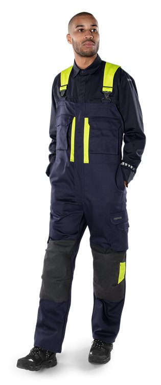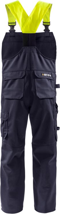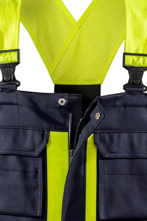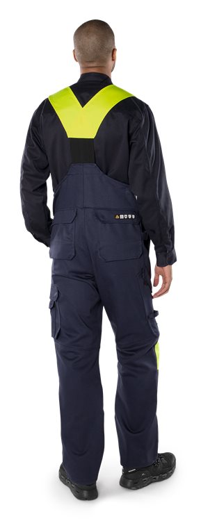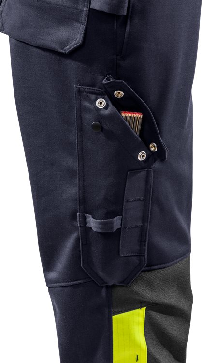 Front placket opening with two-way, full-length front zip and concealed snap fastening / 2 CORDURA reinforced chest pockets with flap and concealed snap fastening, 1 with D-ring / 2 front pockets / Double reinforced crotch seam / 2 CORDURA reinforced back pockets with flap and concealed snap fastening / Hammer loop / CORDURA reinforced folding rule pocket with flap and concealed snap fastening, pen pocket and button and loop for sheath knife / Leg pocket with flap and concealed snap fastening, mobile phone pocket with flap and velcro fastening / Aramide reinforced knee pockets with outside opening with velcro fastening / Height adjustment for knee pads in knee pocket / Approved according to EN 61482-1-2 class 1, EN 61482-1-1 ATPV: 19 cal/cm² ELIM: 13 cal/cm², EN ISO 11612 A1 A2 B1 C1 E3 F1, EN ISO 11611 A1, A2 class 2, EN 1149-5, EN 13034 Type PB (6), EN 14404 together with kneepads 124292 / Approved after 50 washes / Leasing laundry-tested according to ISO 15797 / OEKO-TEX certified. Material: 79% cotton, 20% polyester, 1% anti-static fibre. Reinforcement: 98% aramid fibre, 2% anti-static fibre. Sizes: C44-C66. Features: Hypoallergenic: No Wash Info: – Maximum washing temperature 75°C, normal process;Do not bleach;Tumble drying possible, low temperature, exhaust temperature max. 60°C;Iron at maximum sole-plate temperature of 150°C;Do not dry clean Gender: Male Fabric Weight m2: Colour Names: F556:M3-1 Navy/ Hi-Vis Yellow Certificate