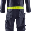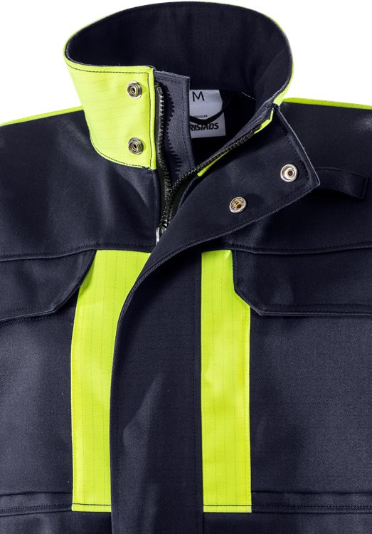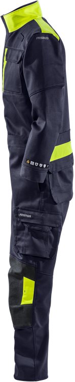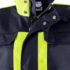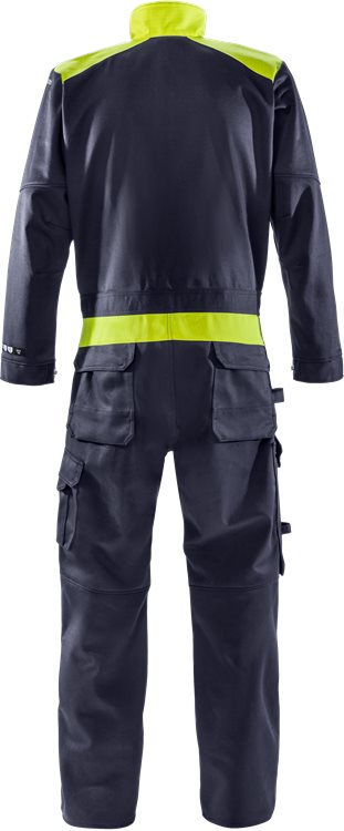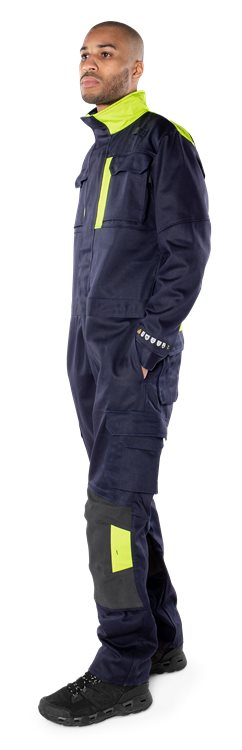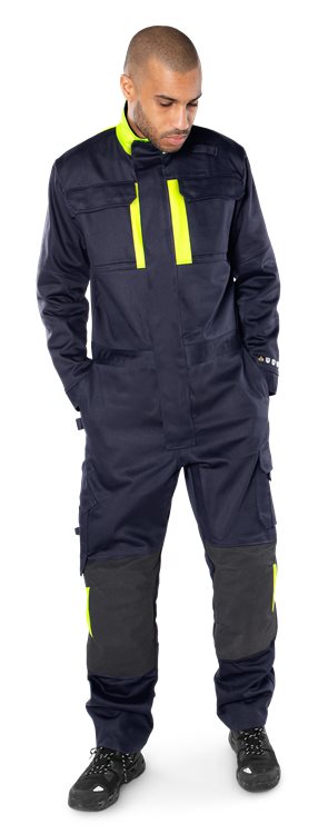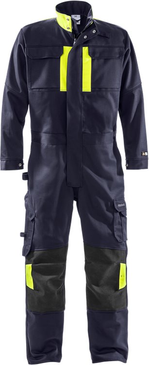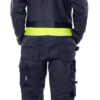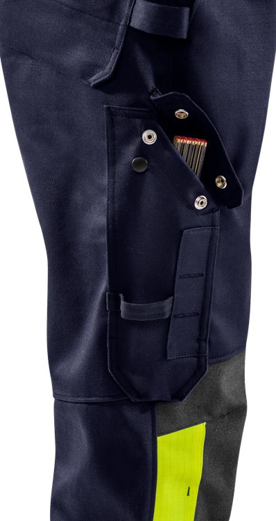 Front placket opening with two-way zip to top of collar and concealed snap fastening / 2 bellowed chest pockets with flap and concealed snap fastening, 1 with inside D-ring / Inside pocket with button fastening and mobile phone pocket with flap and velcro fastening / Adjustable waist with elasticated band and button / Adjustable cuffs with snap fastening / Double reinforced crotch seam / 2 front pockets / 2 CORDURA reinforced back pockets with flap and concealed snap fastening / CORDURA reinforced folding rule pocket with flap and concealed snap fastening and button and loop for sheath knife / Leg pocket with flap and concealed snap fastening, mobile phone pocket with flap and velcro fastening, D-ring / Hammer loop / Aramide reinforced knee pockets with outside opening with velcro fastening / Height adjustment for knee pads in knee pocket / Approved according to EN 61482-1-2 class 1, EN 61482-1-1 ATPV: 19 cal/cm² ELIM: 13 cal/cm², EN ISO 11612 A1 A2 B1 C1 E3 F1, EN ISO 11611 A1, A2 class 2, EN 1149-5, EN 13034 Type PB (6), EN 14404 together with kneepads 124292 / Approved after 50 washes / Leasing laundry-tested according to ISO 15797 / OEKO-TEX certified. Material: 79% cotton, 20% polyester, 1% anti-static fibre. Reinforcement: 98% aramid fibre, 2% anti-static fibre. Sizes: XS-4XL. Features: Hypoallergenic: No Wash Info: – Maximum washing temperature 75°C, normal process;Do not bleach;Tumble drying possible, low temperature, exhaust temperature max. 60°C;Iron at maximum sole-plate temperature of 150°C;Do not dry clean Gender: Male Fabric Weight m2: Colour Names: F556:M3-1 Navy/ Hi-Vis Yellow Certificate