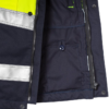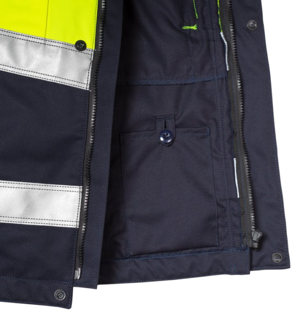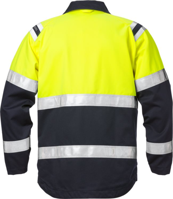Dirt, oil and water repellent / Reflective detailing on shoulders / Front placket opening with zip to top of collar and concealed snap fastening / 2 bellowed chest pockets with flap and concealed snap fastening, 1 with inside D-ring and pen strap and 1 with opening for radio-antenna at top / 1 chest pocket with zip / 2 front pockets with concealed snap fastening / Inside pocket with button / Inside phone pocket with velcro fastening and loop for mobile phone earpiece / Adjustable waist and cuffs / Reflective tape around sleeves / Extended back / Approved according to EN 61482-1-2 class 1, EN 61482-1-1 EBT: 12,8 cal/cm² HAF: 84,2% (see Electric arc table for certified garment combinations for EN 61482-1-2 class 2 and open arc according to EN 61482-1-1), EN ISO 11612 A1 B1 C1 F1, EN 1149-5, EN 13034 Type PB [6] and EN ISO 20471 class 1 sizes XS-S, class 2 sizes M-3XL / Approved after 50 washes / Leasing laundry-tested according to ISO 15797 / OEKO-TEX certified. Material: 45% modacrylic, 35% cotton, 18% polyamide, 2% anti-static fibre. Inherent flame protection. Sizes: XS-3XL. Features: Hypoallergenic: No Wash Info: – Maximum washing temperature 75°C, normal process;Do not bleach;Tumble drying possible, low temperature, exhaust temperature max. 60°C;Iron at maximum sole-plate temperature of 150°C;Do not dry clean Gender: Male Fabric Weight m2: Colour Names: F171:M3-1 Hi-Vis Yellow/ Navy Certificate