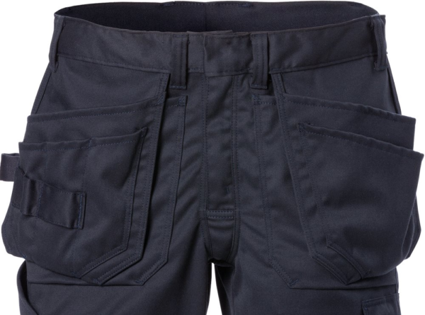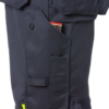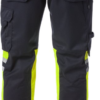 Stretch fabric / Dirt, oil and water repellent / 2 front pockets / 2 CORDURA reinforced loose-hanging pockets, 1 with 3 small pockets and tool loops and 1 with extra pocket / 2 CORDURA reinforced back pockets, one with with flap and concealed snap fastening / Double crotch seam / Hammer loop / CORDURA reinforced folding rule pocket with pen holder and button and loop for sheath knife / Leg pocket with flap and concealed snap fastening, mobile phone pocket with flap and velcro fastening, D-ring under flap / CORDURA reinforced knee pockets with inside opening / Height adjustement for knee pads in knee pocket / CORDURA reinforced leg ends / Reinforced 2 needle stitching on reflective tape / Approved according to EN 14404 together with kneepads 124292, EN 61482-1-2 Class 1, EN 61482-1-1 EBT: 10,3 cal/cm2 HAF: 80% (see Electric arc table for certified garments combinations for EN 61482-1-2 class 2 and open arc according to EN 61482-1-1), EN ISO 11612 A1 B1 C1 F1, EN 1149-5 and EN ISO 20471 class 1 / Fabric is approved according to EN 13034 / Approved after 50 washes / Leasing laundry-tested according to ISO 15797 / OEKO-TEX certified. Material: 45% modacrylic, 34% cotton, 17% polyamide, 2% elastane, 2% anti-static fibre. Inherent flame protection. Sizes: C44-C62, C146-C156, D84-D116. Features: Hypoallergenic: No Wash Info: – Maximum washing temperature 60°C, normal process;Do not bleach;Tumble drying possible, low temperature, exhaust temperature max. 60°C;Iron at maximum sole-plate temperature of 150°C;Do not dry clean Gender: Male Fabric Weight m2: Colour Names: F171:M3-1 Hi-Vis Yellow/ Navy Certificate