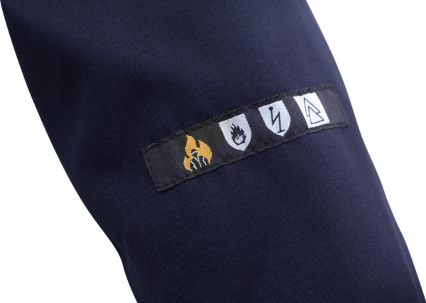Reflective detailing on shoulders / Concealed snap fastening under front placket / Cuffs with concealed snap fastening / Extended back / 2 chest pockets with flap and concealed snap fastenings, 1 with pen loops / Metalfree garment / Approved according to EN 61482-1-2 class 1, EN 61482-1-1 EBT: 9,9 cal/cm² HAF: 78,0% (see Electric arc table for certified garment combinations for EN 61482-1-2 class 2 and open arc according to EN 61482-1-1), EN ISO 11612 A1 A2 B1 C1 F1, EN 1149-5, EN 13034 Type PB [6] / Leasing laundry-tested according to ISO 15797 / OEKO-TEX certified. Material: 54% modacrylic, 44% cotton, 2% anti-static fibre. Inherent flame protection. Sizes: XS-4XL. Features: Hypoallergenic: No Wash Info: – Maximum washing temperature 60°C, normal process;Do not bleach;Tumble drying possible, low temperature, exhaust temperature max. 60°C;Iron at maximum sole-plate temperature of 150°C;Do not dry clean Gender: Male Fabric Weight m2: Colour Names: F540:M3-1 Dark Navy Certificate