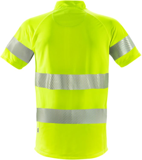 Transports moisture / Absorbs odour / Dries very quickly / Shaped collar / Half zip at front / Raglan sleeves / 3 back pockets / Extended back / Approved according to EN ISO 20471 class 2 sizes XS-L and class 3 sizes XL-4XL / OEKO-TEX certified. Material: 55% polyester och 45% polyester 37.5 by Cocona technology. Sizes: XS-4XL. Features: Hypoallergenic: No Wash Info: – Maximum washing temperature 60°C, normal process;Do not bleach;Tumble drying possible, low temperature, exhaust temperature max. 60°C; Iron at maximum sole-plate temperature of 110°C without steam, steam ironing may cause irreversible damage;Do not dry clean Gender: Male Fabric Weight m2: Colour Names: F130:M3-1 Hi-Vis Yellow Certificate