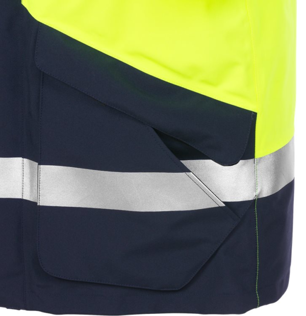 2-layer GORE-TEX material, water and windproof and breathable / Detachable quilted lining – can also be used as shell jacket / Detachable lined hood adjustable with drawstring / Fleece-lined collar / Front placket opening with zip to top of collar and velcro fastening / Chest pocket with water-repellent zip, D-ring inside / Map pocket with inside mobile phone pocket accessible when garment is closed / 2 front pockets with flap and velcro fastening / 2 fleece-lined hand warmer pockets / Adjustable waist with drawstring / Adjustable sleeve end with velcro fastening / Rib-knit inner cuffs with thumb grip / 2 inside pockets in shell jacket / Inside pocket and mobile phone pocket in lining / Zip in lining for easy embroidery and transfer / Waterpillar > 10.000 mm / ePTFE membrane / Breathability RET < 6 / Approved according to EN ISO 20471 class 3, Colour 271 is approved according to RIS-3279-TOM: 2016 Issue 1 UK Railway Standard, EN 343 3/3 and EN 342 / Approved after 25 washes / Leasing-laundry tested according to ISO 15797 / OEKO-TEX certified. Material: 100% polyester, 2-layer GORE-TEX laminate, wind and waterproof but breathable. Lining: 100% polyester. Sizes: XS-3XL. Features: Hypoallergenic: No Wash Info: - Maximum washing temperature 60°C, normal process;Do not bleach;Tumble drying possible, low temperature, exhaust temperature max. 60°C; Iron at maximum sole-plate temperature of 110°C without steam, steam ironing may cause irreversible damage;Do not dry clean Gender: Male Fabric Weight m2: Colour Names: F171:M3-1 Hi-Vis Yellow/ Navy Certificate