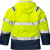 PU-coated polyester jersey / Detachable hood with drawstring / Two-way zip under front placket with buttons / Ventilated yoke at front and back / Concealed D-ring for ID-card holder / 2 front pockets right with mobile pocket / Adjustable sleeves / Approved according to EN ISO 20471 class 2 – size 2XS and class 3 – sizes XS-3XL and EN 343 class 3/1. Material: 100% polyester jersey PU-coated. Sizes: 2XS-3XL. Features: Hypoallergenic: No Wash Info: – Maximum washing temperature 40°C, normal process;Do not bleach;Do not tumble dry;Do not iron;Do not dry clean Gender: Unisex Fabric Weight m2: Colour Names: F171:M3-1 Hi-Vis Yellow/ Navy Certificate