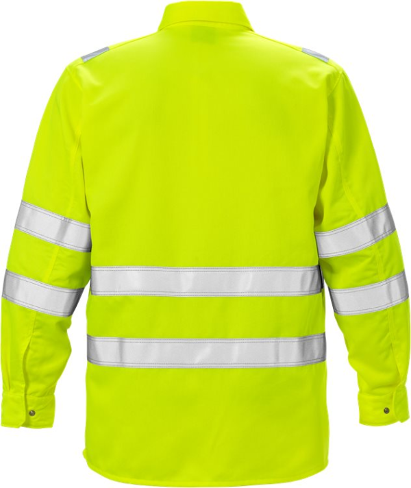 Concealed snap fastenings under front placket / 2 chest pockets with flap and concealed snap fastening, both with pen pockets / Cuffs adjustable with snap fastenings / Extended back / Approved according to EN ISO 20471 class 3 / Approved after 50 washes / Leasing-laundry tested according to ISO 15797 / OEKO-TEX certified. Material: 80% polyester, 20% cotton. Sizes: XS-4XL. Features: Hypoallergenic: No Wash Info: – Maximum washing temperature 60°C, normal process;Do not bleach;Tumble drying possible, low temperature, exhaust temperature max. 60°C; Iron at maximum sole-plate temperature of 110°C without steam, steam ironing may cause irreversible damage;May be dry cleaned using perchlor, mineral turpentine or similar Gender: Male Fabric Weight m2: Colour Names: K130:M3-1 Hi-Vis Yellow Certificate