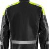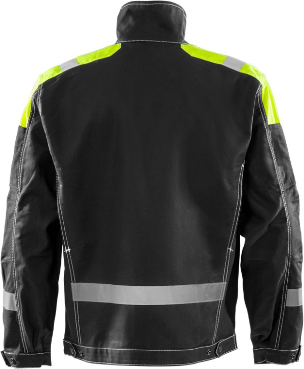 Yellow shoulder panel and reflective tape at shoulders, sleeves and back for increased visibility / Front placket opening with zip to top of collar and concealed snap fastening / 2 chest pockets with flap and snap fastening, one with tool loops, the other with button and loop for sheath knife / 2 front pockets with snap fastening / Inside mobile phone pocket / Inside pocket with button / Sleeve pocket / Concealed ID-card pocket on sleeve / Ventilated back / Adjustable cuffs and hem / OEKO-TEX certified. Material: FAS, Fristads best twill, 100% cotton. Sizes: XS-3XL. Features: Hypoallergenic: No Wash Info: – Maximum washing temperature 85°C, normal process;Do not bleach;Tumble drying possible, low temperature, exhaust temperature max. 60°C;Iron at maximum sole-plate temperature of 150°C;Do not dry clean Gender: Male Fabric Weight m2: 375 Colour Names: F940:M3-1 Black Certificate