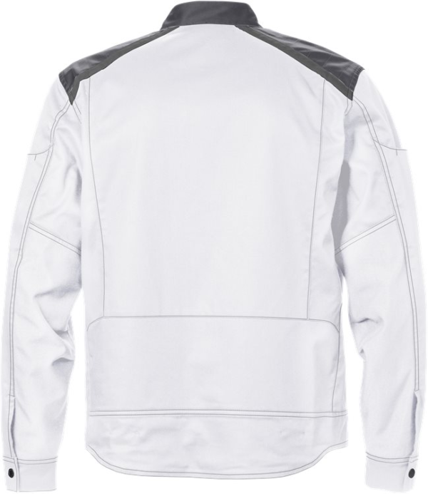 Mechanical stretch fabric / Dark grey reflective details / Stand collar / Full length front zip with concealed snap fastening / 2 chest pockets with flap and concealed snap fastening / D-ring under chest pocket / Inner pocket with button fastening / 2 front pockets with zip / 4 pen pockets on left sleeve / Pocket with snap fastening on right sleeve / Adjustable waist and cuffs / CORDURA-reinforced elbows / Extended back / Leasing-laundry tested according to ISO 15797 / OEKO-TEX certified / RFID chip can be added as a VAS solution. Material: 65% polyester, 35% cotton. Sizes: XS-4XL. Features: Hypoallergenic: No Wash Info: – Maximum washing temperature 85°C, normal process;Do not bleach;Tumble drying possible, low temperature, exhaust temperature max. 60°C;Iron at maximum sole-plate temperature of 150°C;Do not dry clean Gender: Male Fabric Weight m2: Colour Names: F965:M3-1 White/ Grey Certificate