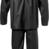 Jacket: Hood adjustable with drawstring and foldable with velcro strap / Front opening with snap fastening and inside placket with velcro fastening / 2 front pockets with snap fastening / Yoke ventilation at back / Raglan sleeves / Sleeve adjustable with snap fastening / Reflective details at shoulders. Trousers: Elasticated waist, adjustable with string / Adjustable leg end with snap fastening / Reflective details on legs / Approved according to EN 343 class 3/1. Material: 100% polyester. Sizes: 2XS-3XL. Features: Hypoallergenic: No Wash Info: – Maximum washing temperature 40°C, normal process;Do not bleach;Do not tumble dry;Do not iron;Do not dry clean Gender: Male Fabric Weight m2: Colour Names: F940:M3-1 Black Certificate