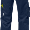 Mechanical stretch fabric / Dark grey reflective details / Concealed front button / 2 front pockets / 2 back pockets / Double crotch seam / 2 thigh pockets / Leg pocket with extra pockets / Loop for folding rule inside leg pocket / Leg pocket with flap and velcro fastening, mobile phone pocket and extra pocket with flap and velcro fastening, D-ring under flap / CORDURA-reinforced leg ends / Adjustable leg length with 5 cm hem allowance / Leasing-laundry tested according to ISO 15797 / OEKO-TEX certified / D sizes in colour 965 available as make to order solution / RFID chip can be added as a VAS solution. Material: 65% polyester, 35% cotton. Sizes: C44-C62, D84-D120. Features: Hypoallergenic: No Wash Info: – Maximum washing temperature 85°C, normal process;Do not bleach;Tumble drying possible, low temperature, exhaust temperature max. 60°C;Iron at maximum sole-plate temperature of 150°C;Do not dry clean Gender: Male Fabric Weight m2: Colour Names: F556:M3-1 Navy/ Hi-Vis Yellow Certificate